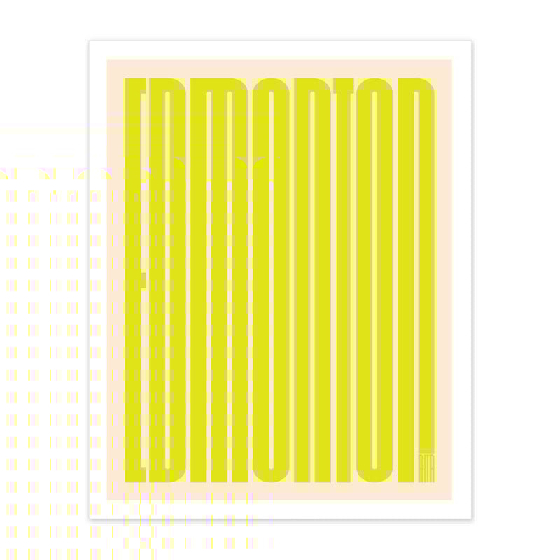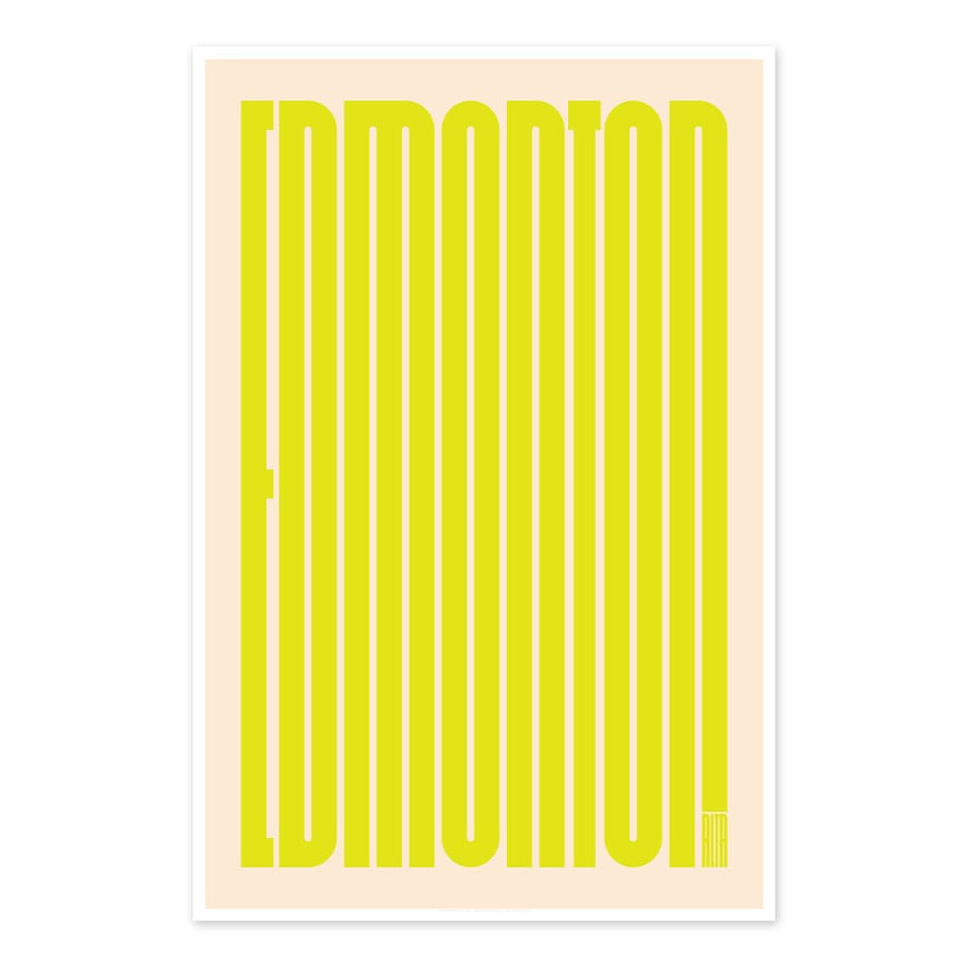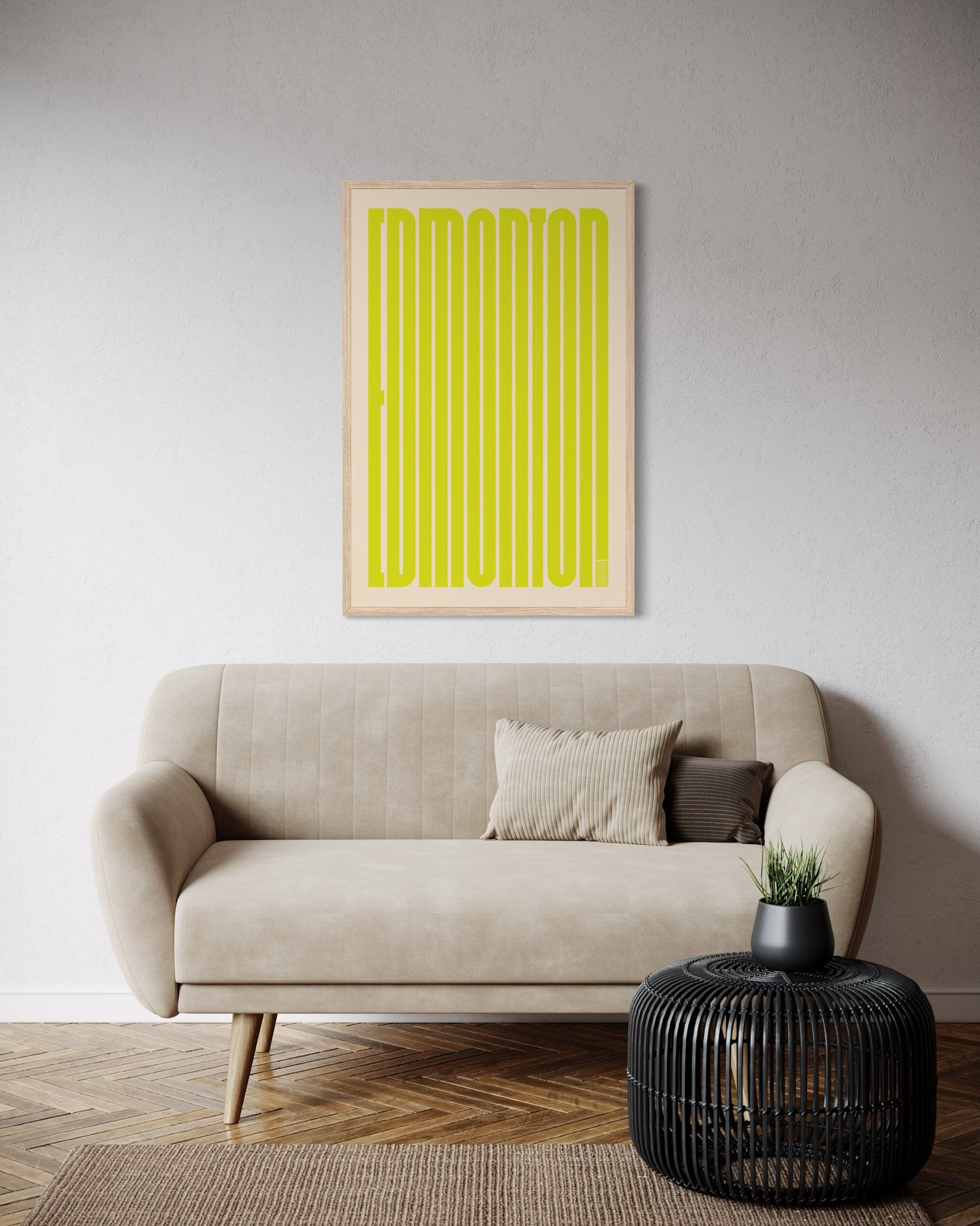 A bold Edmonton typography print in warm golden tones, featuring elongated vertical lettering and modernist design. A refined graphic piece that transforms the city’s name into a striking visual statement.