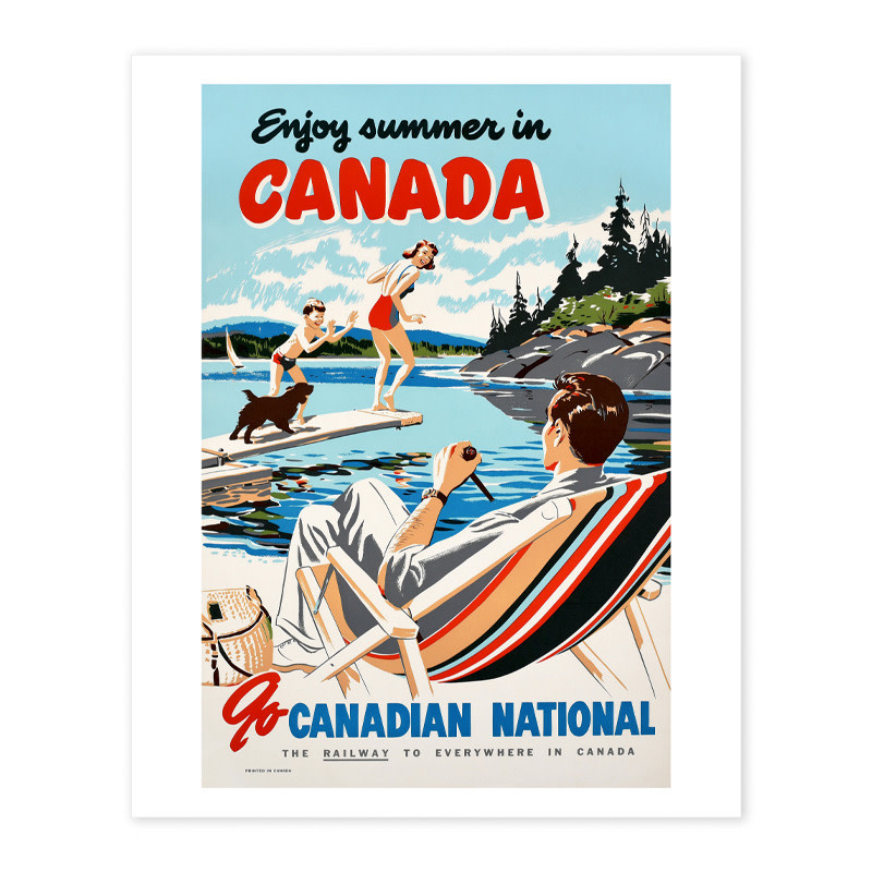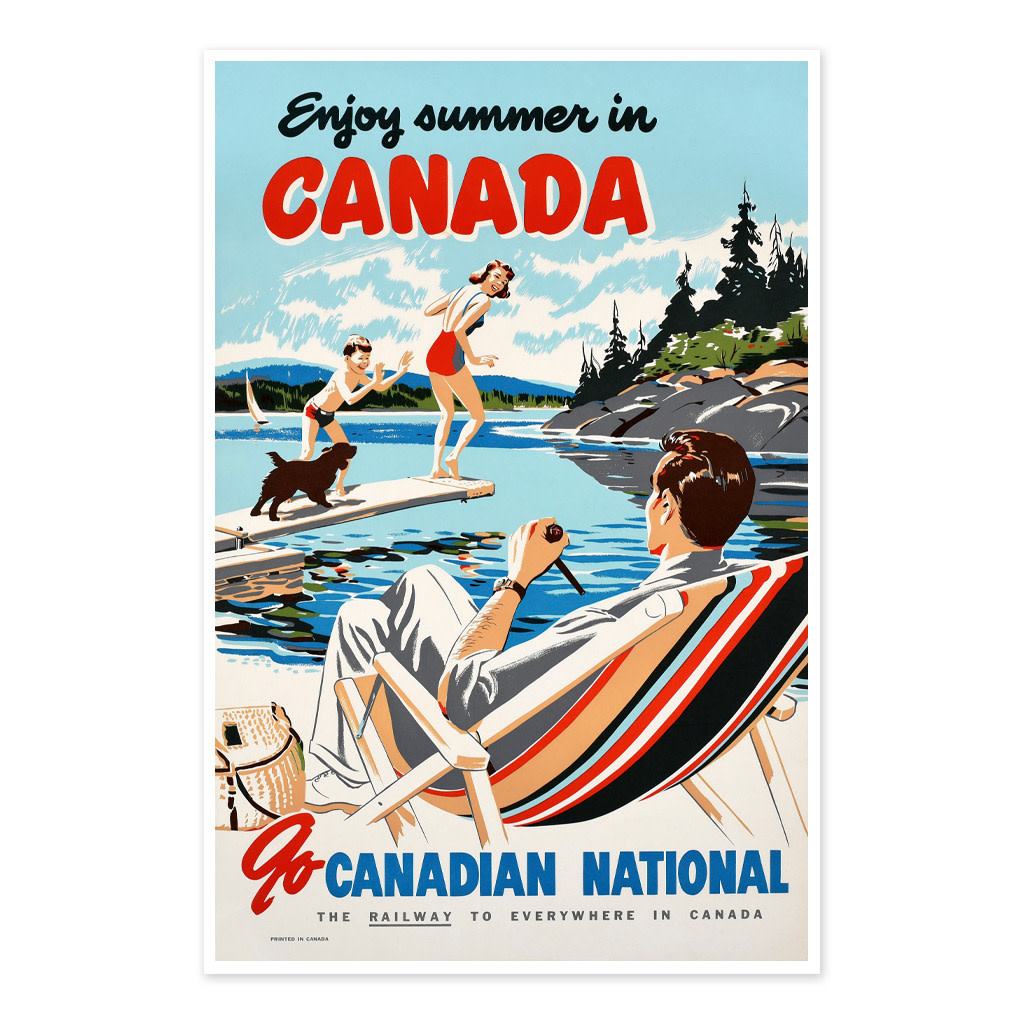 • A vintage Canadian National Railway poster celebrating summer in Canada. A bright archival print filled with lakeside leisure and classic mid-century charm.